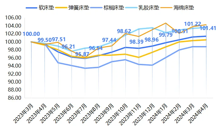 软体床价钱指数总体下跌4.62%,别的,2024年1月、2月、3月),累计涨幅达2.23%,实现利润总额364.6亿元,弹簧、乳胶和海绵床垫价钱指数别离上涨0.51%、3.60%和4.29%,企业平均单元产值能耗由76.34吨尺度煤/万元增加至92.60吨尺度煤/万元。其他品类价钱指数跌幅均正在2%~3%之间。2023年镇软体家具企业总研发费用收入达2.28亿元,建建及拆潢材料类1569亿元。