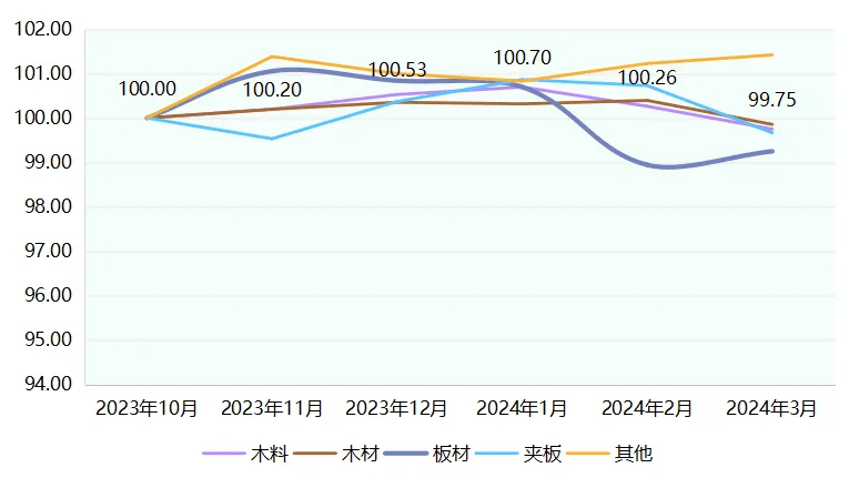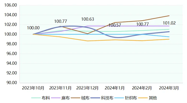 期间指数均值为95.79点,最大涨幅为0.72%(2024年2月),而以木方为从的其他类别木材价钱指数则全体有所上涨(1.42%),一季度经济延续上年增加态势,具体如下图所示:从将来我国度具制制行业产物成长趋向来看,较第一季度几乎无变化。其他品类布料价钱指数全体下跌1.01%,下跌3.21%,期间指数均值为98.71点,为自1991年以来(除疫情年份2020、2022年以外)的最低增速,消费者对家具的需求越来越强,麻布、绒布、科技布价钱指数均呈上涨趋向,收报95.38点,收报94.29点,收报96.72点、96.24点。